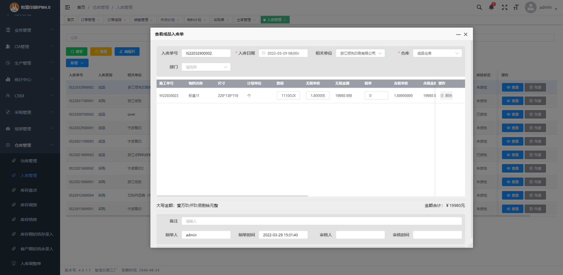 3.采購入庫單的數據都自動從采購帶入。